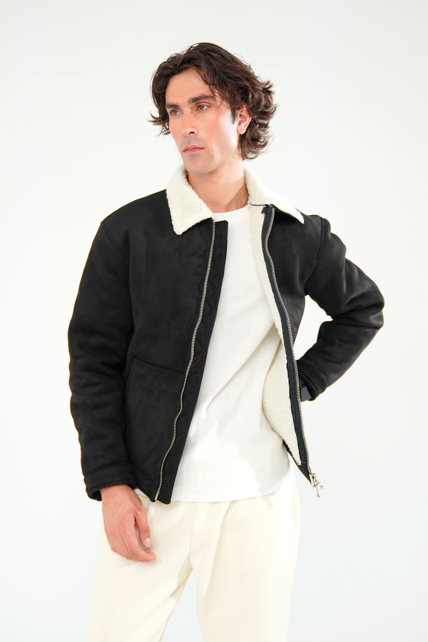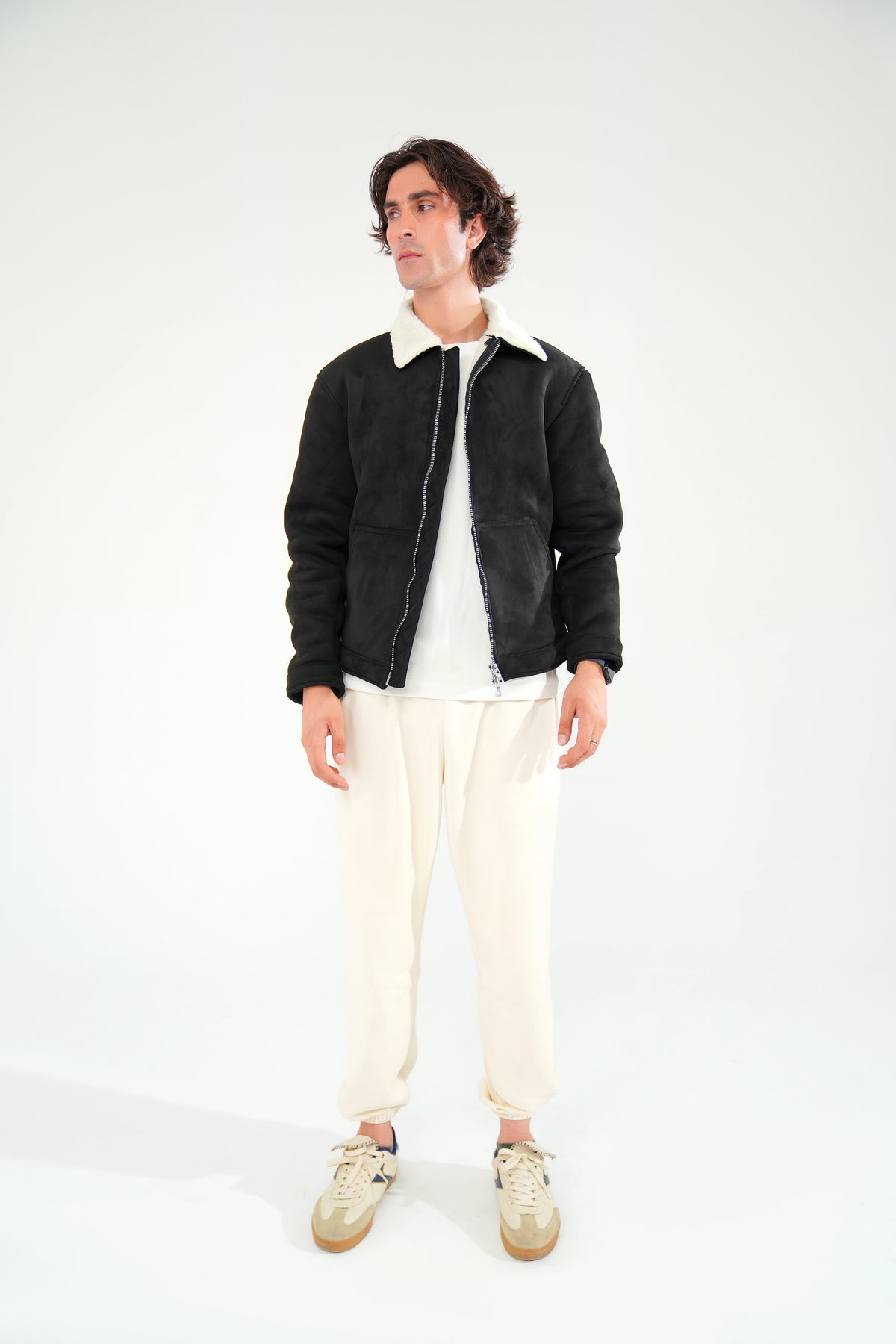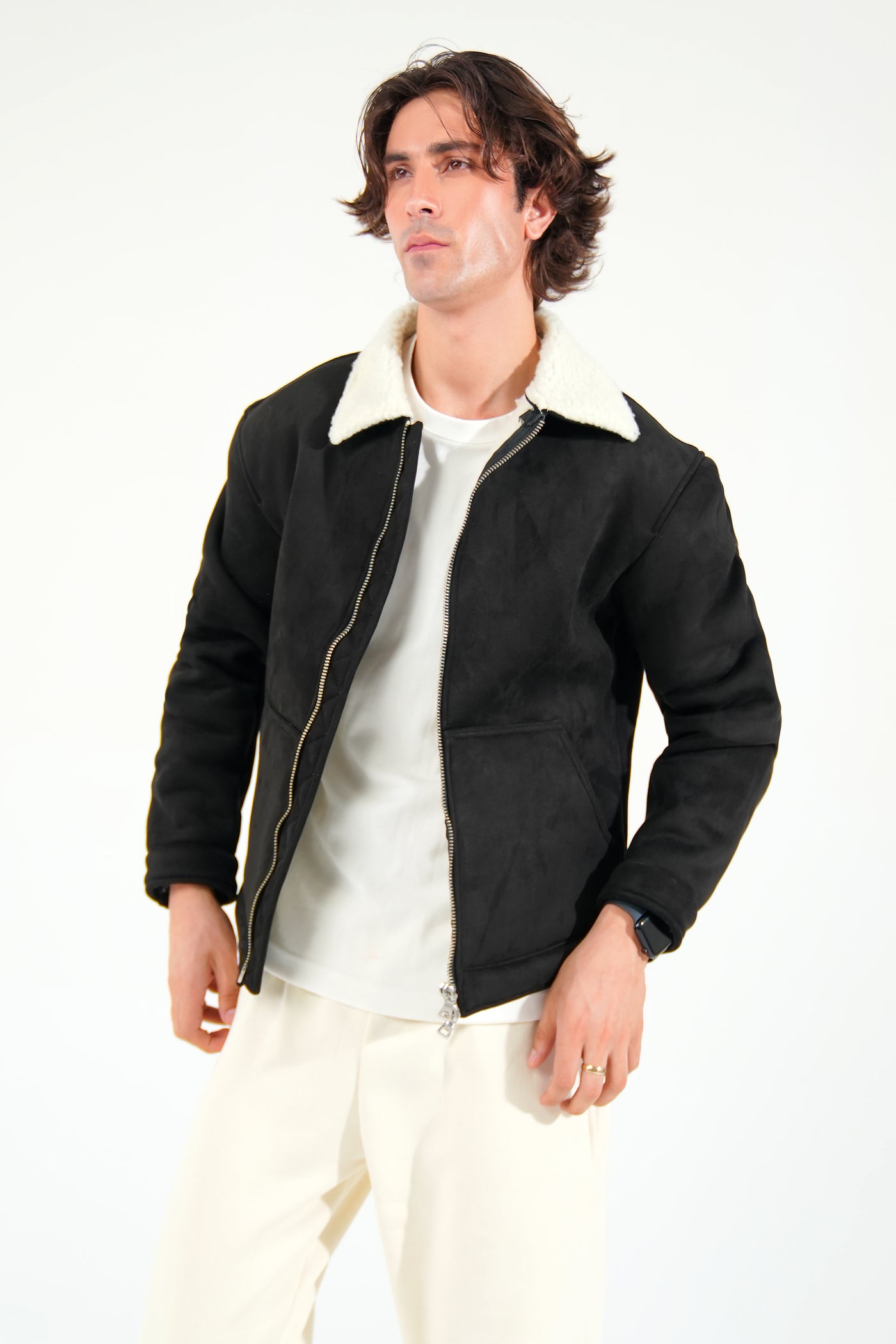 Classic, clean, and always in style, the black premium suede jacket is a wardrobe essential. Designed with a tailored fit and soft faux shearling lining, it offers both warmth and sophistication. The premium suede outer shell provides a luxurious finish, while silver zip hardware and structured cuffs give it an edgy, polished look. Ideal for layering over tees, turtlenecks, or sweaters.