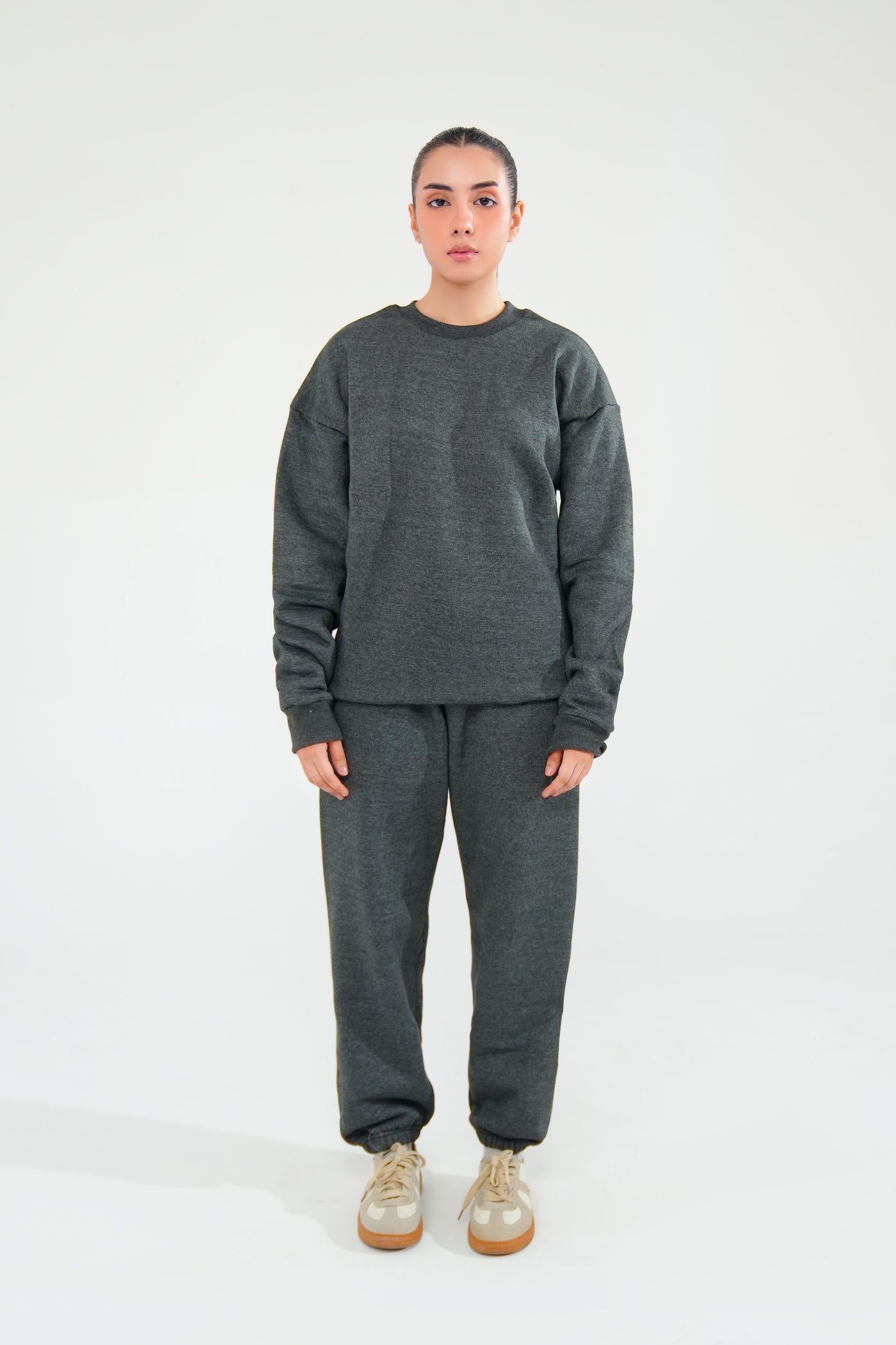 Elevate your basics with this charcoal grey oversized sweatshirt. Built from thick 350 GSM fleece, it offers a warm, comfortable fit and a clean silhouette. Ideal for casual styling or pairing with joggers for a complete streetwear look.